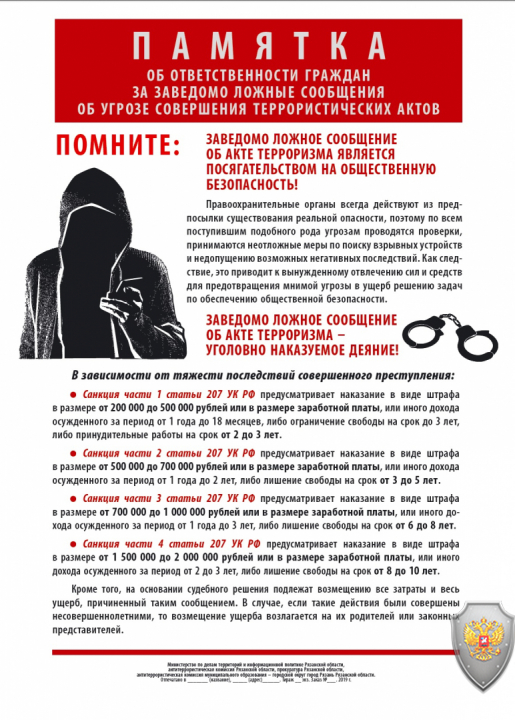 Памятка. Заведомо ложное сообщение об акте терроризма - уголовно наказуемое деяние.